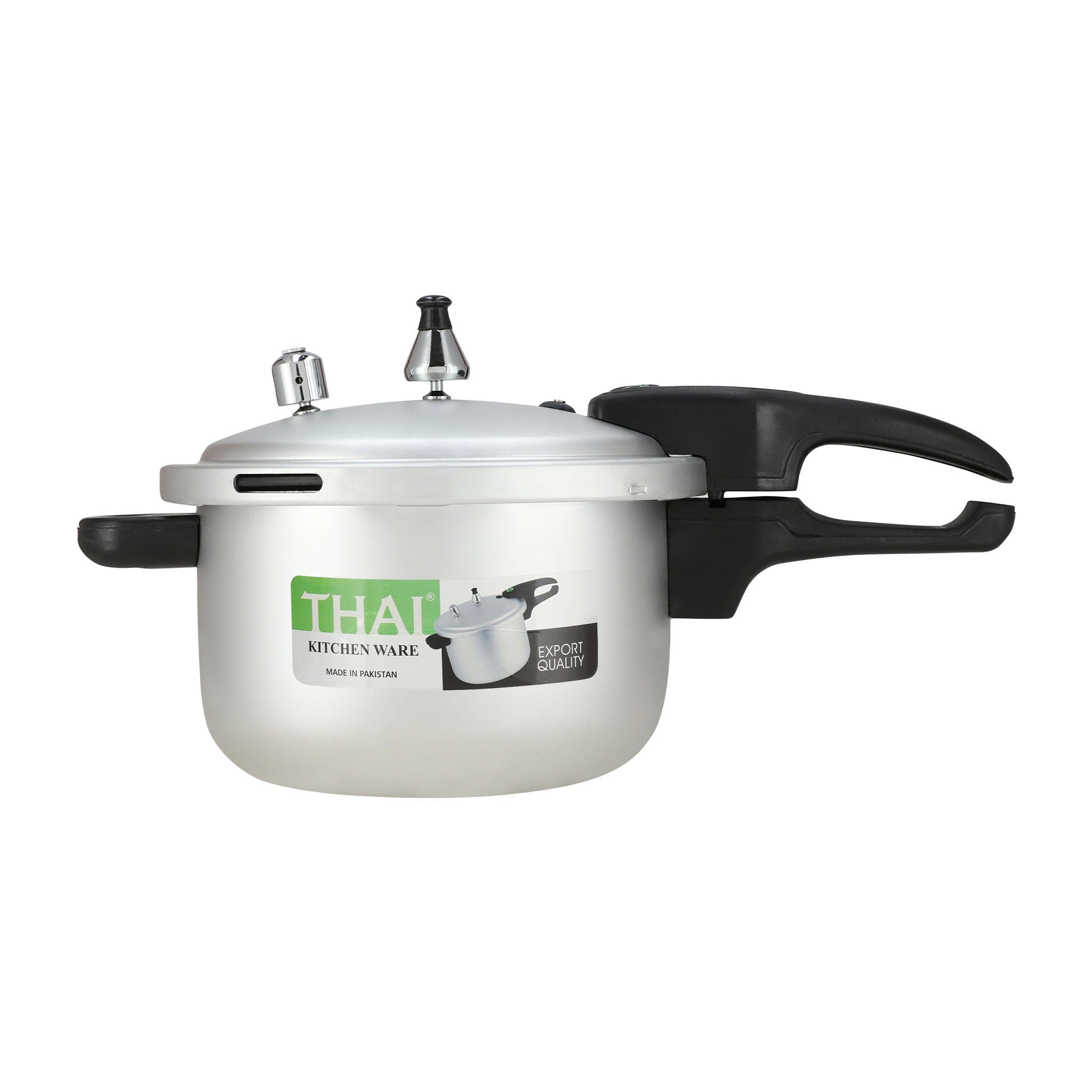 Royal Thai 5 liter Pressure Cooker is widely constructed to achieve larger volume.Heavy-duty lid locks down during cooking with an inner sealing ring keeps the steam in which preserves flavors and nutrients, and even tenderizes lean cuts of meat. Even heat distribution makes the food cook 3 times faster and bakelite handles on the side provide a comfortable and easy grip for safe cooking.